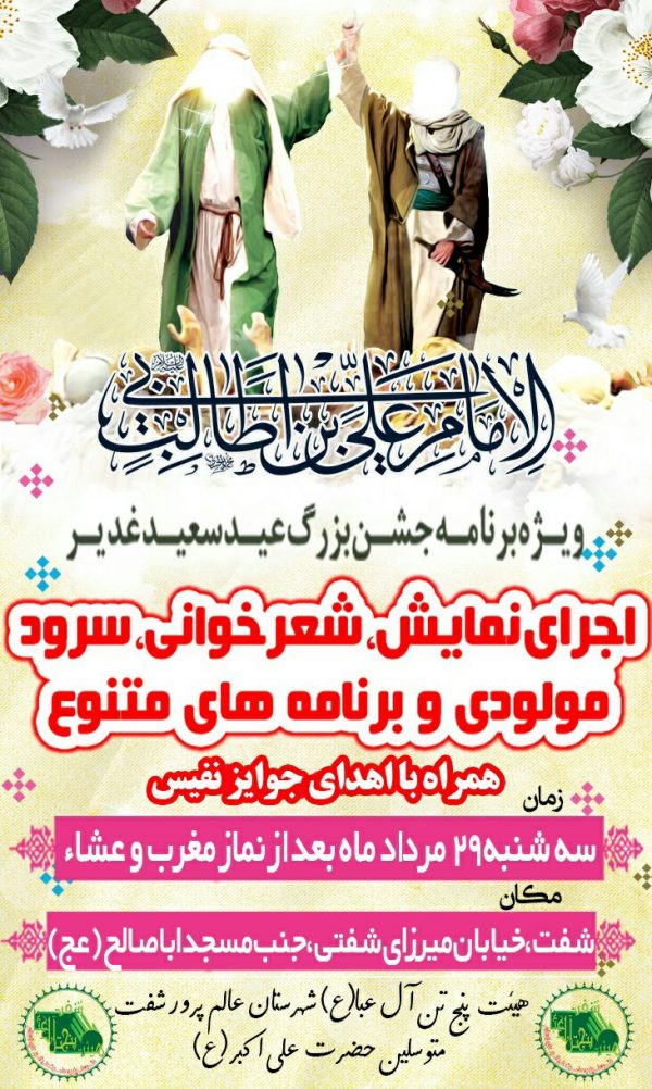 به گزارش ورس ، هیئت پنج تن آل عبا(ع) و متوسلین حضرت علی اکبر(ع) شهرستان شفت با صدور اطلاعیه ای از برگزاری ویژه برنامه جشن بزرگ عید سعید غدیر خبر داده است .