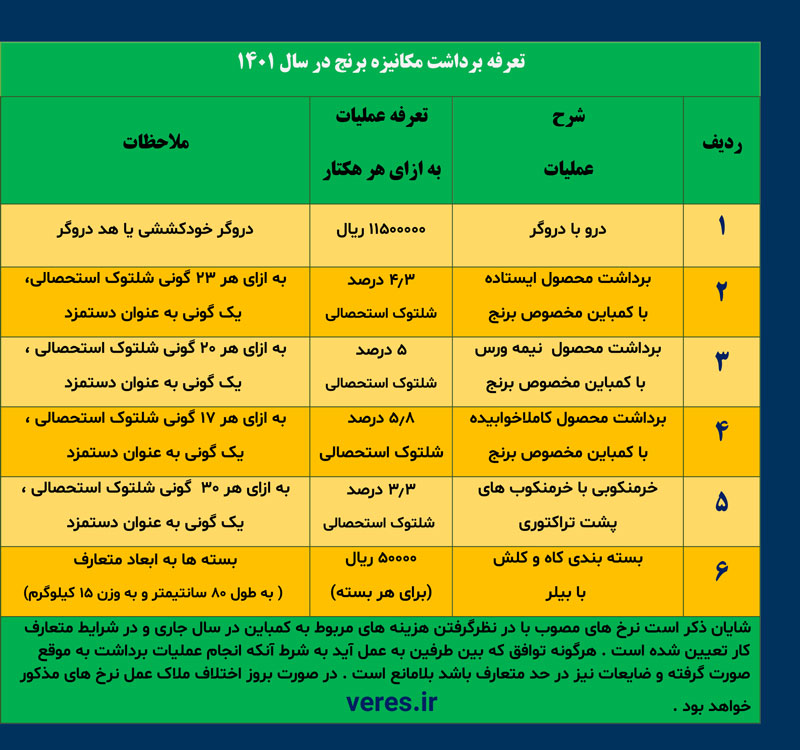 شایان ذکر است نرخ های مصوب با در نظرگرفتن هزینه های مربوط به کمباین در سال جاری و در شرایط متعارف کار تعیین شده است . هرگونه توافق که بین طرفین به عمل آید به شرط آنکه انجام عملیات برداشت به موقع صورت گرفته و ضایعات نیز در حد متعارف باشد بلامانع است . در صورت بروز اختلاف ملاک عمل نرخ های مذکور خواهد بود .