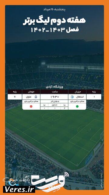 امروز آخرین دیدار هفته دوم لیگ برتر در ورزشگاه آزادی برگزار میشود و استقلال به مصاف ملوان میرود تا پرونده بازیهای این هفته بسته شود.